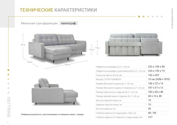 Бельевой ящик (ШхВхГ): 142х14х72 см (прямая часть), 107х12х57 см (оттоманка)