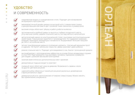 Стильные ножки "под дерево", практичная стежка, эксклюзивный дизайн с легким намеком на стиль 60-х годов - диван Орлеан на механизме пантограф впечатляет легкостью и простотой раскладывания и складывания механизма. Изящный и грациозный - он создан для динамичных и независимых людей, открытых всему новому.  Компактные и лаконичные формы, в меру строгий и сдержанный дизайн. Подходит для ежедневного использования.