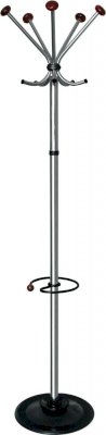 Офисная вешалка напольная на 5 крючков. Снабжена подставкой для зонтов. Утяжеленное двойное основание. Выполнена из оцинкованной стали с полимерным покрытием. Штанга из зеркальной нержавеющей стали. Декоративные наконечники (шары) – натуральное дерево.