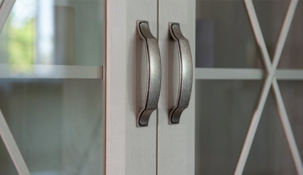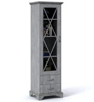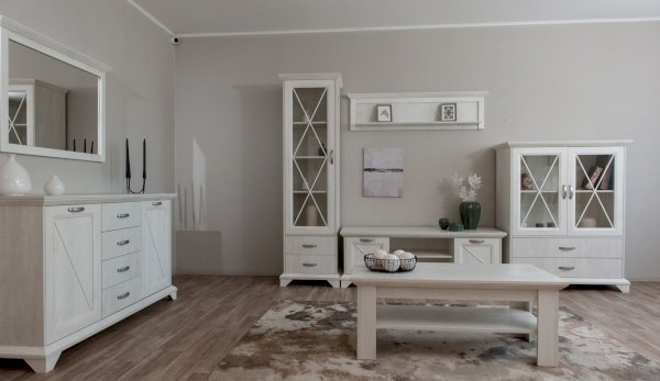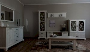 Пенал-витрина добавит уюта в интерьер гостиной в стилях неоклассика или прованс. Белые рамочные фасады с фактурой и рисунком натурального дерева, декоративные крестообразные накладки, фигурные ножки и карниз все это придает комнате элегантный и светлый вид. За прозрачным фасадом можно расположить предметы декора, красивый сервиз или книги. Выдвижные ящики на телескопических направляющих предназначены для хранения различных вещей. Мебель выполнена из экологичных материалов.