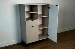 Дизайн комода продуман до мелочей: с одной стороны расположена глухая дверца, за которой скрывается просторное пространство для хранения. С другой стороны – ниша с открытой полкой, выкатной ящик и ещё одна глухая дверца, что позволяет гибко организовать хранение и поддерживать порядок в доме.