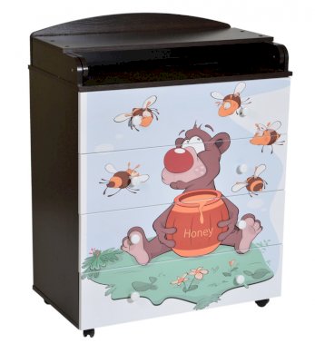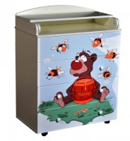 Пеленальный комод 800/4 Lilu 4 отличается привлекательным дизайном с использованием тематических детских принтов. В конструкции изделия предусмотрены 4 маленьких передвижных колеса, несколько вместительных ящичков на шариковых направляющих и откидывающаяся пеленальная столешница. Детский пеленальный комод, декорированный красочным рисунком, вмещает в себя постельные принадлежности, средства гигиены, распашонки, подгузники, игрушки, ползунки и другие личные вещи ребенка. Гладкая столешница идеально подходит для пеленания ребенка, а колесики позволяют быстро перемещать комод.