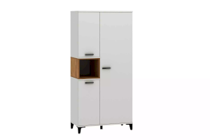 Шкаф оснащен полками за распашными дверками и открытой нишей, которая может быть собрана как на правую, так и на левую стороны, и в ней можно удобно расположить книги или элементы декора, а высокие опоры придают внешнюю легкость и обеспечивают быстрый и легкий доступ во время уборки.