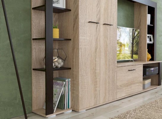 Гостиная Торонто - оригинальный дизайн, вместительность и небольшие габариты. Занимая мало места по глубине и ширине, она включает в себя платяной шкаф с штангой, нишу под ТВ и множество полок для приставок, колонок, книг и декора. Использование популярных цветов Дуб сонома и венге даёт возможность легко сочетать эту стенку в гостиной с другими предметами мебели – столами, журнальными столиками, стеллажами или комодами. Выполнена из экологичных материалов.